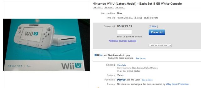 Уже начались первые аукционы Wii U — на сайте eBay доступно более 2500 лотов с новой игровой консолью. Часто система там продаётся дороже $500 из-за превышения спроса над предложением. При этом на аукционе желающие могут найти и консоли по нормальной цене. Например, в рамках одного из предложений, приведённого на скриншоте, покупатели могут приобрести 8-Гбайт версию системы по обычной в США цене $300.