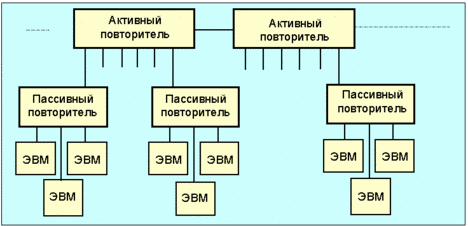 Эта сеть базируется на идее маркерной шины и может позволить реализовать топологию шины, кольца или звезды при скорости обмена 2,5Мбит/с. Сеть строится вокруг активных и пассивных повторителей (HUB). Активные повторители (обычно 8-канальные) могут соединяться друг с другом, с пассивными повторителями/разветвителями и оконечными ЭВМ (рабочими станциями). Длина таких соединений, выполняемых 93-омным коаксиальным кабелем (RG-62, разъемы BNC), может достигать 600м. Допускается применение скрученных пар (RS485) или оптического волокна. Пассивный 4-входовый повторитель позволяет подключать до трех рабочих станций кабелем длиной до 35 м, один из входов всегда занят соединением с активным повторителем. Пассивные повторители не могут соединяться друг с другом. Активные повторители могут образовывать иерархическую структуру. Максимальное число рабочих станций в сети равно 255. Предельная суммарная длина кабелей многосегментной сети составляет около 7 км. Схема соединений в сети arcnet показана на рис. 4.1.5.1 (пунктиром обозначены возможные связи с другими активными повторителями или маршрутизаторами). В настоящее время разработан стандарт arcnet plus, рассчитанный на скорость обмена до 20 Мбит/с, совместимый с прежней версией. Новый стандарт позволяет строить сети с числом станций в 8 раз больше, чем старый. Если в сети присутствуют узлы, рассчитанные на разную скорость обмена, выбор полосы пропускания осуществляется при установлении связи. Соединение с другими сетями (например, Ethernet, Token Ring или Интернет) возможно через специальные шлюзы, мосты или маршрутизаторы. Каждому узлу в сети присваивается уникальный адрес в диапазоне от 1 до 255. Стандарт arcnet поддерживает работу с пакетами двух длин: <253 или 506. Отличительной особенностью сети является низкая избыточность – заголовки пакетов имеют длину 3-4 байта. Все пакеты в arcnet начинаются с байта, содержащего единицы во всех разрядах. Всего в arcnet используется пять разновидностей пакетов: