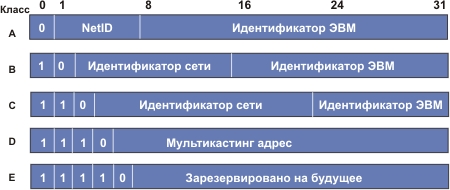 Рис. 4.1.1.3.2. Структура IP-адресов (NetID = идентификатор сети)