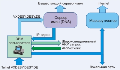 Для того чтобы пояснить взаимодействие различных систем в сети, рассмотрим сильно упрощенную схему обработки команды telnet vxdesy.desy.de, которая предполагает осуществление удаленного доступа к vx-кластеру в ДЕЗИ, Гамбург (вызов через windows обрабатывается практически аналогично). Сначала ЭВМ выделяет команду telnet и запускает соответствующую программу. Эта программа рассматривает символьный адрес vxdesy.desy.de в качестве параметра команды telnet.