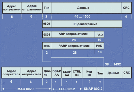 Кадр Ethernet 802.2 помимо первых трех полей содержит дополнительные три однобайтовые поля, следующие вслед за ними (DSAP, SSAP и CNTL). Кадр Ethernet SNAP является модификацией кадра Ethernet 802.2. Для этого кадра коды полей dsap и ssap равны 0xAA (признак кадра Ethernet SNAP), код CNTL=03 (нечисловой формат), поле код организации (3 байта, характеризует организацию сети) равен нулю (для IPX/SPX), а двухбайтовое поле тип характеризует протокол высокого уровня. Для протоколов IPX/SPX в этом поле должен быть записан код 0x8138 (для ip – 0x0800, для arp – 0x0806, для rarp – 0x8035, а для Apple Talk – 0x809b). Таблица кодов протоколов приведена в приложении Базовые протоколы Интернет (см. также RFC-1700). Поля тип протокола и по смыслу и по содержанию идентичны для всех разновидностей кадра Ethernet (кроме ieee 802.3).
