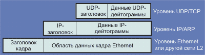 При формировании пакетов различного уровня используется принцип инкапсуляции (вложения). Так IP-пакеты вкладываются в Ethernet-пакеты (кадры). Всякий пакет имеет заголовок и тело, некоторые из них снабжены контрольной суммой. Схема такого вложения представлена на рисунках 4.1.1.3.4 и 4.1.1.3.5.