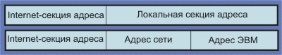 IP-адрес имеет Интернет- и местную секции, первая характеризует место (организацию, сеть или даже группу сетей), вторая – конкретную ЭВМ. Местная секция адреса может быть разделена на части, характеризующие локальную сеть и конкретную ЭВМ (рис. 4.1.1.3.3).