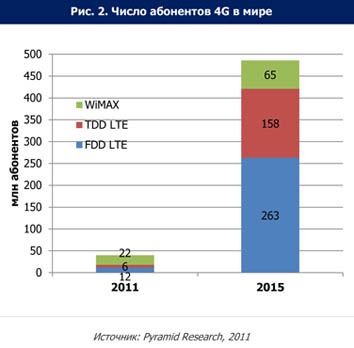 Имея сопоставимые с LTE характеристики, технология WiMAX оказалась менее приспособленной к массовому развертыванию. Многие ключевые вендоры свернули инвестиции в WiMAX и переориентировались на LTE. По различным прогнозам, к 2015 г. на долю WiMAX придется только около 1% рынка мобильного ШПД в целом и до 13% абонентской базы 4G в мире (Рис. 2). В России WiMAX также останется нишевой технологией с долей рынка, по прогнозам J’son & Partners Consulting, не превышающей 1% мобильного ШПД.