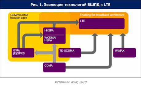 В настоящее время существует две основные технологии, условно относящееся к четвертому поколению связи (4G) – это LTE и WiMAX. При этом основным преимуществом LTE является то, что этот стандарт стал следующей ступенью развития технологии 3G (UMTS/HSPA, HSPA+), в то время как WiMAX является отдельной ветвью эволюции мобильного ШПД (Рис. 1) .