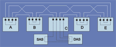 Частота ошибок в сети не превышает 10-9. В FDDI используется схема двойного кольцевого счетчика (рис. 1; буквами a,b,c,d и e обозначены станции-концентраторы). Кольцевая схема единственно возможное решение для оптического волокна (не считая схемы точка-точка). Для доступа к сети используется специальный маркер (развитие протокола IEEE 802.5 – Token Ring). Сети FDDI не имеют себе равных при построении опорных магистралей (backbone) локальных сетей, позволяя реализовать принципиально новые возможности – удаленную обработку изображений и интерактивную графику. Обычно устройства (DAS – dual attached station) подключаются к обоим кольцам одновременно. Пакеты по этим кольцам движутся в противоположных направлениях. В норме только одно кольцо активно (первичное), но при возникновении сбоя (отказ в одном из узлов) активизируется и второе кольцо, что заметно повышает надежность системы, позволяя обойти неисправный участок (схема соединений внутри станций-концентраторов на рис.1 является сильно упрощенной). Предусмотрена возможность подключения станций и только к одному кольцу (SAS – single attached station), что заметно дешевле. К одному кольцу можно подключить до 500 das и 1000 sas. Сервер и клиент имеют разные типы интерфейсов.
