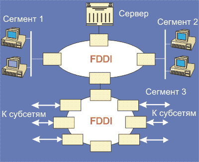 Рис. 7. Схема использования кольца FDDI для расширения пропускной способности локальной сети