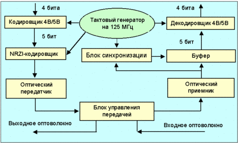 Уровень MAC (media access control) определяет доступ к сетевой среде, включая формат кадров, адресацию, алгоритм вычисления crc и механизм исправления ошибок. Уровень PHY (physical layer protocol) задает процедуру кодирования/декодирования, синхронизацию, формирование кадров и пр. В качестве базовой используется кодировка 4b/5b (преобразование 4-битного кода в 5-битный), а в канале – NRZI. Уровень PMD (physical layer medium) определяет характеристики транспортной среды, включая оптические каналы, уровни питания, регламентирует частоту ошибок, задает требования к оптическим компонентам и разъемам. Блок схема интерфейса между уровнями MAC и PHY показана на рис. 3.