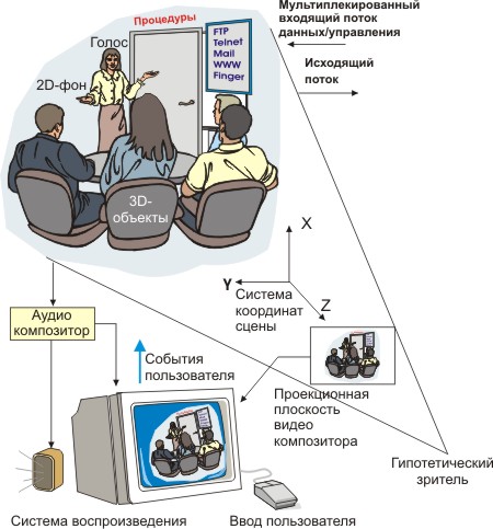 Представляет блоки звуковой, визуальной и аудиовизуальной информации, называемые “медийными объектами”. Эти медийные объекты могут быть естественного или искусственного происхождения; это означает, что они могут быть записаны с помощью камеры или микрофона, а могут быть и сформированы посредством ЭВМ;