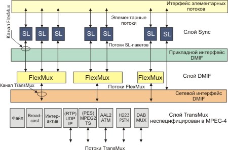 Слой “TransMux” (Transport Multiplexing) на рис. 2 моделирует уровень, который предлагает транспортные услуги, удовлетворяющие требованиям QoS. MPEG-4 специфицирует только интерфейс этого слоя, в то время как остальные требования к пакетам данных будут определяться транспортным протоколом. Любой существующий стек транспортных протоколов, например, (RTP)/UDP/IP, (AAL5)/ATM, или MPEG-2 Transport Stream поверх подходящего канального уровня может стать частным случаем TransMux. Выбор оставлен за конечным пользователем или серис-провайдером, и позволяет использовать MPEG-4 с широким спектром операционного окружения.