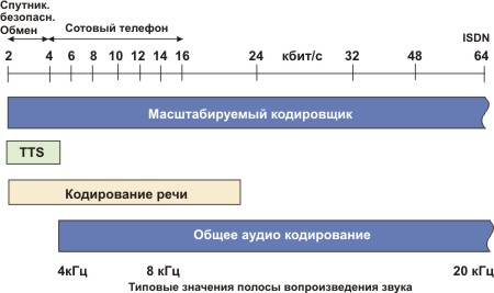 Общие аудио сигналы. Поддержка общей кодировки аудио потоков от низких скоростей до высококачественных. Рабочий диапазон начинается от 6 кбит/с при полосе ниже 4 кГц и распространяется до широковещательного качества передачи звукового сигнала для моно и многоканальных приложений.