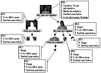 Так как описательные характеристики должны иметь смысл в контексте приложения, они будут различными для разных приложений. Это подразумевает, что один и тот же материал может быть описан различным образом в зависимости от конкретного приложения. Возьмем в качестве примера визуальный материал: нижним уровнем абстракции будет описание, например, формы, размера, текстуры, цвета, движения (траектории) и позиции (“где на сцене может размещаться объект”). А для аудио: ключ, тональность, темп, вариации темпа, положение в звуковом пространстве. Высшим уровнем представления будет семантическая информация: “Это сцена с лающей коричневой собакой слева и голубым мячом, падающим справа, с фоновым звуком проезжающих авто”. Могут существовать промежуточные уровни абстракции.
