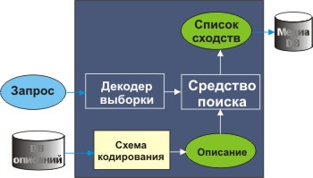 Приложение поиска и получения данных, показанное на рис. 26, относится к типу клиентского приложения. Сначала все описания базы данных, которые могут быть извлечены из медиа приложения, декодируются и загружаются в память. Из медиа данных с помощью средства выборки может быть извлечено и описание запроса. С другой стороны запрос может быть загружен непосредственно из файла. После получения всех входных данных, запрос обрабатывается для всех элементов базы данных, а результирующие расстояния (значения отличия) используются для сортировки данных согласно уровню соответствия запросу. Наконец, сортированный список записывается в качестве медиа базы данных в файл.