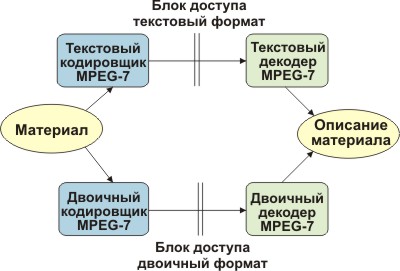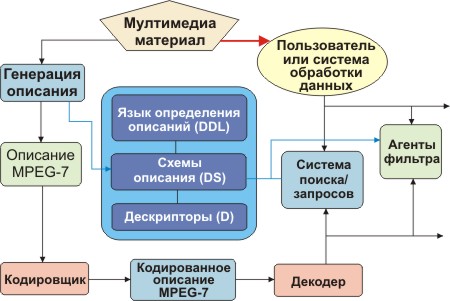 Описание, сформированное с помощью средств MPEG-7, будет ассоциировано с самим материалом, чтобы позволить быстрый и эффективный поиск и фильтрацию материала, представляющего интерес для пользователя.