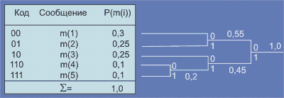 На следующем шаге наименее вероятными сообщениями окажутся m(1) и m(2). Кодовые слова на полученном дереве считываются справа налево. Алгоритм выдает оптимальный код (минимальная избыточность).