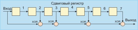 В Ethernet Вычисление crc производится аппаратно (см. также ethernet). На рис. 2.7.1. показан пример реализации аппаратного расчета CRC для образующего полинома B(x)= 1 + x2 + x3 +x5 + x7. В этой схеме входной код приходит слева.