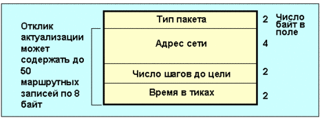 Поле тип пакета содержит код 0x0001, если это запрос, и 0x0002, если отклик. В поле адреса сети записывается адрес сети места назначения, если пакет является запросом. Если в поле записан код 0xff ff ff ff, это означает, что запрос относится ко всем известным сетям. Поле число шагов до цели имеет смысл лишь в случае пакетов-откликов. В этом случае сюда заносится число маршрутизаторов, которые должен пройти пакет по дороге к сети назначения. Поле время в тиках имеет смысл для пакетов-откликов и указывает на время, необходимое для достижения сети адресата. Один тик равен 1/18 секунды. Сходный протокол маршрутизации используется в сетях appletalk (RTMP).