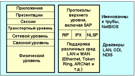 На рис. 4.2.1.4 представлена схема соответствия протоколов Novell и 7-уровневой модели osi.