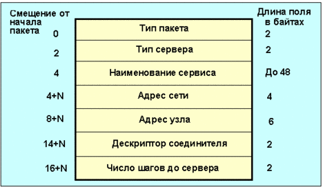 Поле тип пакета принимает значение 0x0002 для SAP-откликов общего обслуживания (General Service Response) и 0x0004 для отклика ближайшего сервера. Запросы о ближайшем сервере используются для поиска в сети сервера конкретной разновидности (пакет запроса содержит лишь первые два поля). Реально отклик будет получен от всех серверов данного типа, а не только от ближайшего. Насколько данный сервер близок, определяется по числу маршрутизаторов до него. Эти запросы/отклики служат для составления списка доступных серверов. Поле тип сервера содержит код доступного вида услуг, а в поле наименование сервиса записывается имя услуги уникальное для данного сервера (длина поля на рис. 4.2.1.5 равна N). Поле адрес сети представляет собой 4-байтовое число, которое идентифицирует адрес сервера. Поле адрес узла характеризует адрес сервера в сети. Службы NetWare указывают адрес 0x00.00.00.00.00.01. Поле дескриптор соединителя характеризует код соединителя, который будет использовать сервер. Последнее поле – число шагов до сервера (число транзитных сетей) характеризует число маршрутизаторов между сервером и клиентом. При отключении сервера от сети он должен широковещательно разослать SAP-уведомление “Останов сервера”. Уведомление содержит код сервера и его полный адрес.