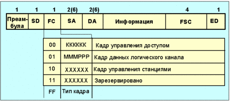SD – (Start Delimiter) – стартовый байт-разделитель =**0**000, где * – символ, кодируемый неманчестерским кодом; FC – (Frame Control) поле управления кадром = FFxxxxxx, где FF – субполе формата кадра, а xxxxxx – биты типа кадра, SA и DA адреса отправителя и получателя, соответственно. FSC – (Frame Control Sequence) контрольная сумма (4 байта). ED – (End Delimiter) оконечный разграничитель =**1**11E (правый бит является 8-ым). MMM=000 – запрос, не требующий подтверждения; MMM=001 – запрос, требующий подтверждения, MMM=010 – отклик на запрос. PPP – биты приоритета (111 – высший приоритет, а 000 – низший). Значения кодов поля FC приведены в таблицах 1 и 2 (цифрами обозначен порядок передачи разрядов).