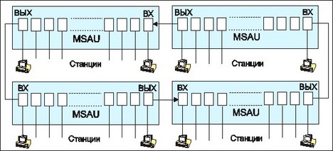 Сетевые станции подключаются к MSAU, которые объединяются друг с другом, образуя кольцо. Если станция отключилась, MSAU шунтирует ее, обеспечивая проход пакетов. Стандарт Token Ring использует довольно сложную систему приоритетов, которая позволяет некоторым станциям пользоваться сетью чаще остальных. Кадры Token Ring имеют два поля, которые управляют доступом приоритет и резервирование. Только станции с приоритетом равным или выше, чем приоритет маркера, могут им завладеть. Если маркер уже захвачен и преобразован в информационный кадр, только станции с приоритетом выше, чем у станцииё отправителя, могут зарезервировать маркер на следующий цикл. Станции, которые подняли приоритет маркера, должны его восстановить после завершения передачи.