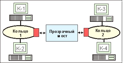 При построении больших сетей token ring приходится использовать большое число колец. Отдельные кольца связываются друг с другом, как и в других сетях, с помощью мостов (рис. 16). Мосты бывают “прозрачными” (IEEE 802.1d) и с маршрутизацией от источника. Последние позволяют связать в единую сеть несколько колец, использующих общий сетевой IPX- или IP-адрес.