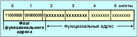Широковещательный адрес подразумевает обращение ко всем узлам данной сети, такой адрес содержит 1 во всех своих разрядах. Мультикастинг-адрес подразумевает обращение к некоторой, выделенной группе адресов данной локальной сети. Существуют также функциональные адреса (FA), которые идентифицируют некоторые известные функциональные объекты с помощью групповых адресов. Формат функционального адреса представлен на рис. 13.