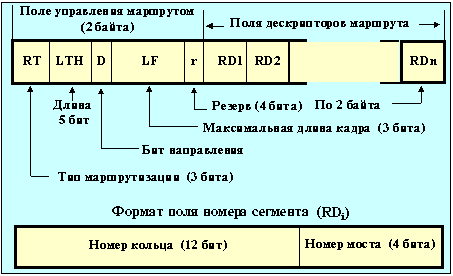 Субполе LTH (длина) имеет 5 бит и хранит в себе длину поля RI в октетах. LTH должно быть четным и лежать в пределах 2-30, включительно. Обычно маршрутная информация занимает от 2 до 16 байт (cпецификация IBM требует, чтобы кадр проходил не более 7 мостов). Если субполе бит направления (d) равно нулю, обход кольца маркером осуществляется в порядке записи дескрипторов маршрута, при d=1 – в обратном порядке (RDN, RDn-1, … RD1). Субполе максимальная длина кадра (LF) имеет 3 бита и указывает наибольший размер информационного поля MAC. Значение поля устанавливается мостами при определении маршрута и указывает максимальную длину кадра, передаваемого мостом. Допустимы следующие значения: