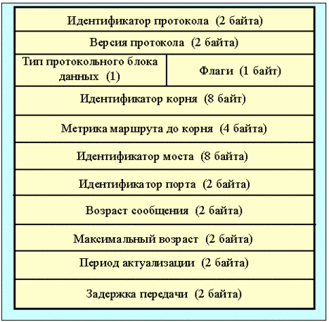 Поле идентификатор корня содержит идентификатор корневого моста. В поле метрика маршрута до корня хранится оценка маршрута до корневого моста. В поле идентификатор моста записывается 8-байтовый код-идентификатор моста, передающего протокольный блок данных. Содержимое двух старших байт задается администратором сети, остальные 6 байт хранят универсальный или локальный адрес порта моста. Идентификатор порта представляет собой двух-байтовый код, присвоенный порту моста. Поле возраст сообщения содержит время в секундах, прошедшее с момента формирования конфигурационного сообщения. При ретрансляции протокольного блока конфигурации каждый мост увеличивает код в этом поле на величину, заданную протоколом управления. Величину кода в поле максимальный возраст задает корневой мост так, чтобы все остальные мосты имели согласованные значения возраста информации о конфигурации. Поле период актуализации определяет длительность периода посылки протокольных блоков конфигурации в секундах. Поле задержки передачи указывает на заданную корневым мостом величину времени в секундах, в течение которого порт не должен начинать передачу кадров после окончания реконфигурации сети.