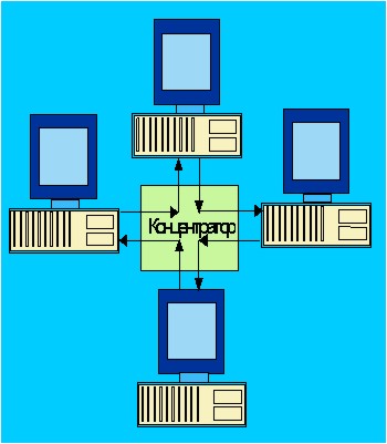 Периферийные ЭВМ подключаются к блокам msau по схеме звезда, а сами MSAU соединены друг с другом по кольцевой схеме. Возможна реализация схемы звезда и иным способом, показанным на рис.2. Здесь объединяющую функцию выполняет блок концентратора.