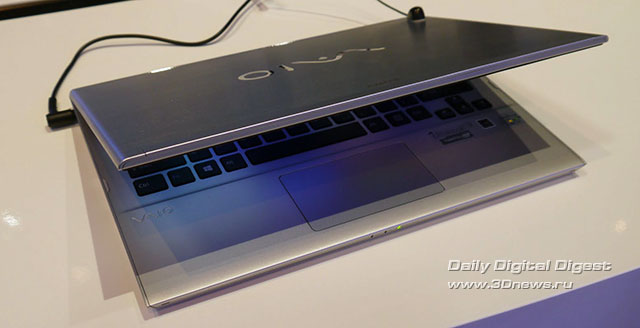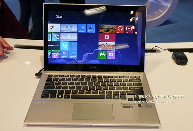 Например, можно было видеть ультрабук Sony VAIO T (SVT1311C5E) с 13,3-дюймовым экраном (1366×768) стоимостью от $800. Внутри корпуса размещён процессор Intel Core i7-3517U @1,9/3 ГГц со встроенным видеоядром Intel HD Graphics 4000, от 4 Гбайт памяти DDR3-1333, гибридный жёсткий диск, совмещающий 500 Гбайт магнитной памяти и 32 Гбайт флеш-памяти MLC. Компьютер способен работать до 7,5 часов автономно.