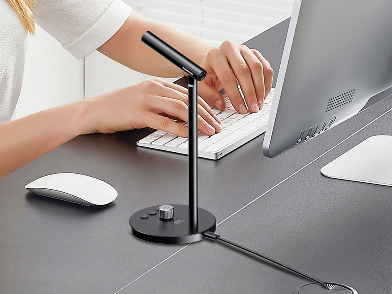 Мікрофон важить 290 г і має висоту 107 мм. Корпус виготовлений з алюмінієвого сплаву, штанга регулюється в межах 60 градусів. Всеспрямований конденсаторний капсуль працює в діапазоні 100–15 000 Гц із частотою дискретизації 16 біт / 48 кГц. У пристрій вбудовано цифрове шумозаглушення DSP. Підключення здійснюється через порт USB-C, також передбачено роз’єм 3,5 мм для навушників.