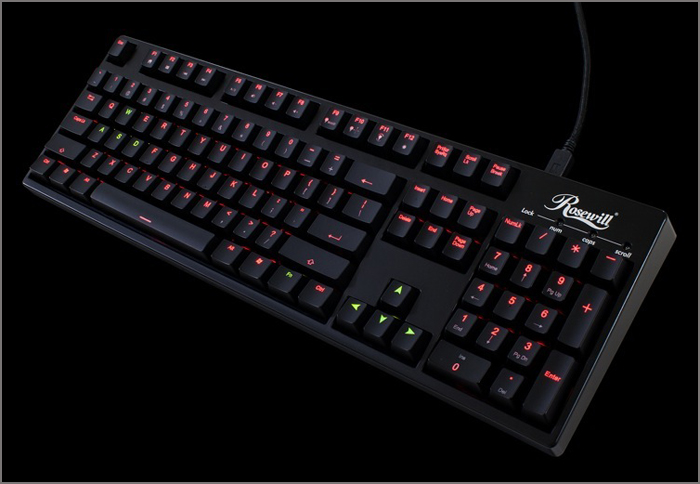 Компания Rosewill Inc. представила механическую клавиатуру Helios RK-9200 для геймеров, оснащённую светодиодной подсветкой с пятью уровнями яркости, причём для кнопок «W», «A», «S», «D» и клавиш управления курсором выбран зелёный цвет, а для остальных – красный.