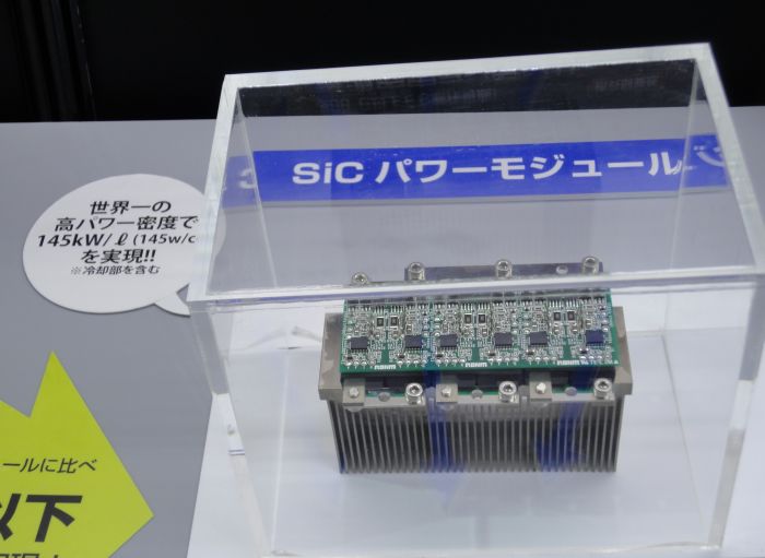 Японская компания Rohm в рамках выставки CEATEC 2012 представила прототип модуля питания на основе элементов из карбида кремния, выходная объёмная плотность мощности которого составляет 145 кВт/литр. Это самое большое значение в отрасли, утверждают разработчики. Новинка способна питать 60-киловаттный трёхфазный двигатель переменного тока. При этом максимально допустимое напряжение устройства достигает 600 В, а максимальный выходной ток — 600 А. Модуль обеспечивает частоту коммутации 20 кГц при напряжении 350 В и токе 575 А. Источник питания нацелен на использование в автомобильной промышленности и может работать при температурах вплоть до 200 градусов Цельсия.