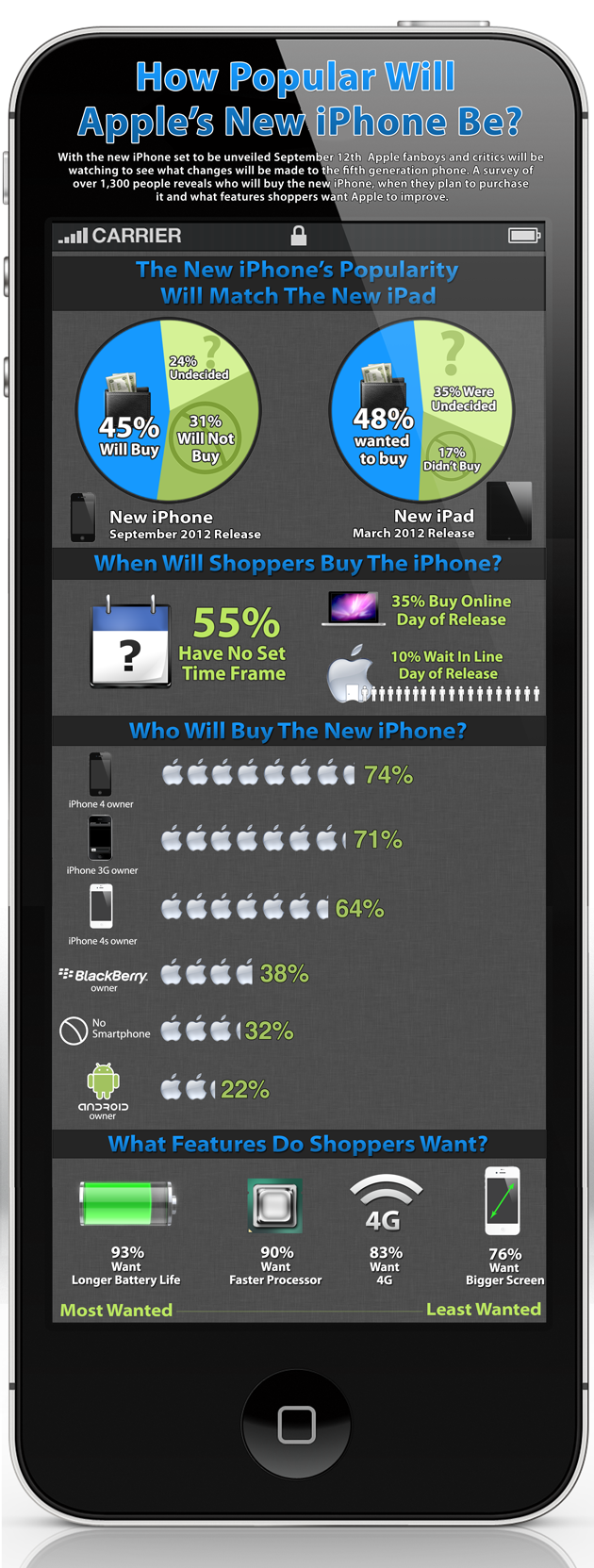 Согласно опросу, проведённому сайтом Techbargains.com, каждый пятый владелец Android-смартфона своим следующим телефоном видит Apple iPhone нового поколения (известного под именем iPhone 5). Среди 1300 респондентов большинство пользователей не довольны временем автономной работы, производительностью своего смартфона, а также желают иметь возможность работы в сетях 4G LTE.