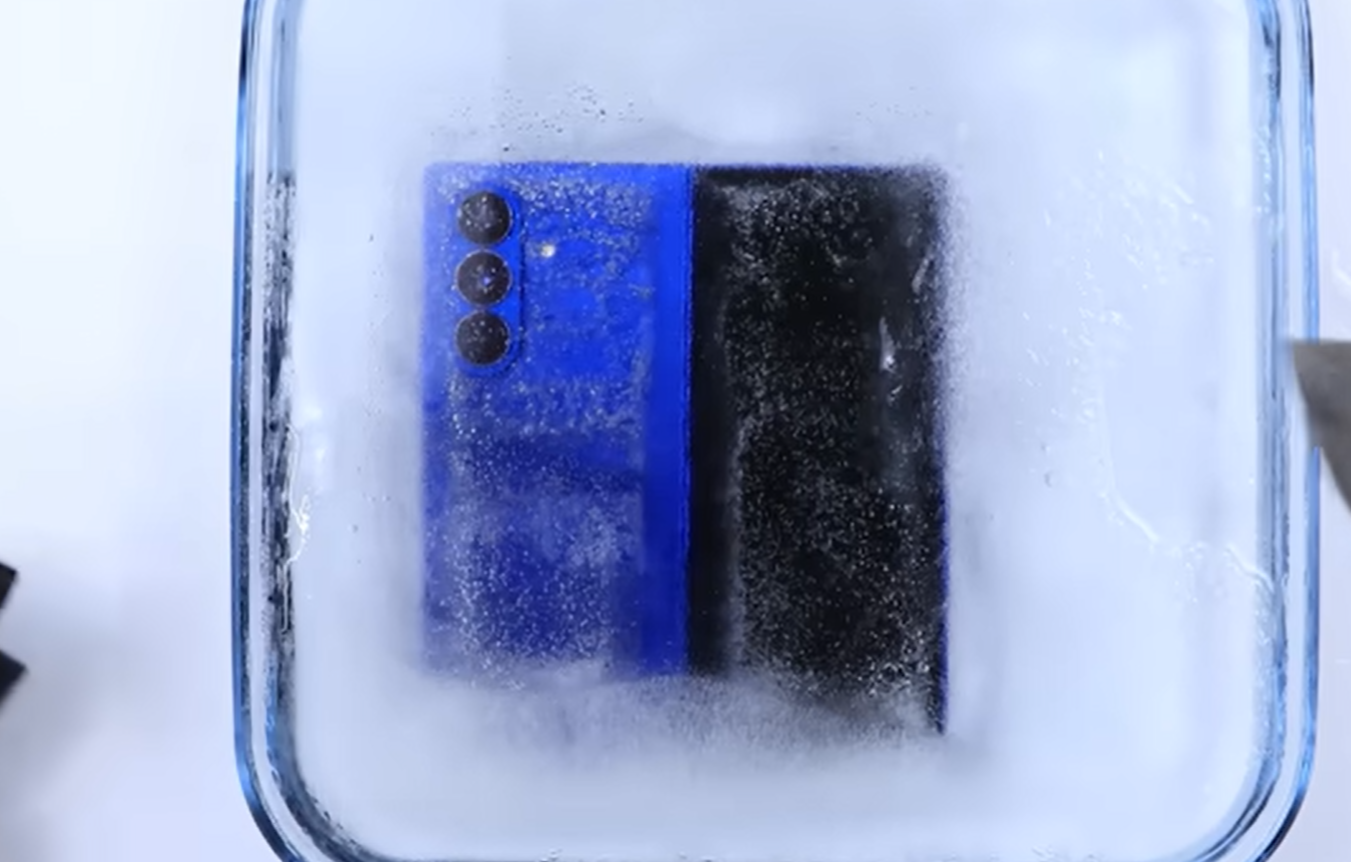 - Тест на заморожування та відтавання: гаджет був поміщений крижаний блок, заморожений, а після відтавання через 12 годин. Пристрій пережив це випробування абсолютно цілим, що свідчить про його стійкість до екстремальних температур.