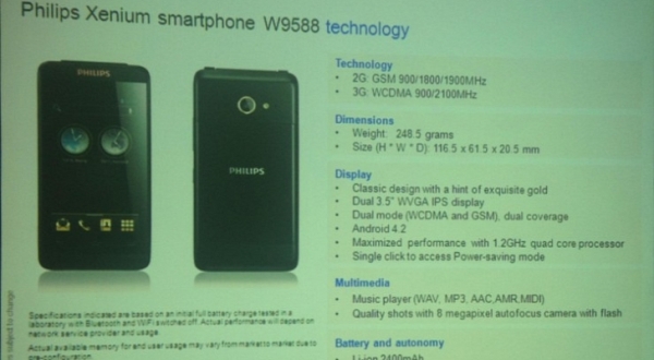 Смартфон Philips W9588 оснащен двумя 3,5” IPS-дисплеями (внешним и внутренним) с разрешением 480×800 точек, четырехъядерным процессором с тактовой частотой 1,2 ГГц (скорее всего, MediaTek MT6589), 8-Мп камерой и имеет на борту 1 Гбайт оперативной памяти, 4 Гбайт флеш-памяти плюс слот для карт памяти microSD объемом до 32 Гбайт, а также модули беспроводной связи. Емкость батареи устройства составляет 2400 мАч. Размеры корпуса равны 116,5×61,5×20,5 мм, вес — 248,5 г. Смартфон работает под управлением ОС Android 4.2 Jelly Bean. В режиме разговора продолжительность автономной работы Philips W9588 достигает 13 часов, в режиме серфинга в Интернете составляет около 10 часов.