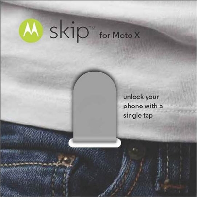 Компания Motorola Mobility, по информации веб-источников, готовит оригинальный аксессуар под названием Moto X Skip, рассчитанный прежде всего на будущих владельцев флагманского смартфона Moto X. Moto X Skip, судя по имеющимся изображениям, представляет собой небольшую клипсу с интегрированными микрочипом NFC. Установив связь со смартфоном, пользователи смогут снимать блокировку с него, минуя обычные процедуры вроде ввода пароля или рисунка. Для получения доступа к аппарату будет достаточно прикоснуться пальцем к поверхности аксессуара.