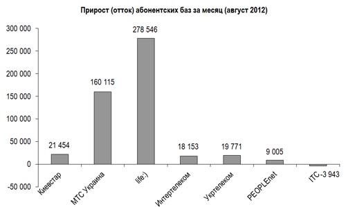 Лидером по росту абонентской базы среди украинских операторов сотовой связи в августе стал life:) – его абонентская база выросла на 278 546 пользователей, на втором месте – МТС Украина (160 115 новых абонентов), на третьем, со значительным отрывом, «Киевстар», который в августе добавил 21 454 абонентов. Впрочем, это не мешает «Киевстару» по-прежнему занимать львиную долю рынка (45%).