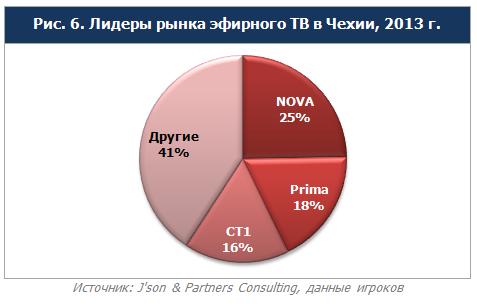 Среди рассмотренных стран Восточной Европы наиболее концентрированный рынок отмечен в Чехии – доля трех лидирующих игроков составляет почти 60% всего сегмента, и только 40% приходится на другие телеканалы.