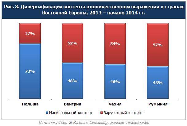 По данным экспертов J’son & Partners Consulting, на сегодняшний день структура телевизионного вещания на рынке стран Восточной Европы не является однородной. В зависимости от рассматриваемого государства и строгости его законодательства в отношении зарубежных производителей, доминирует либо национальный, либо иностранный контент.