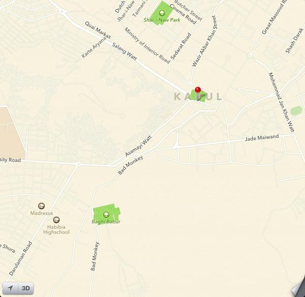 Неудачи продолжают преследовать Apple Maps, которые называют одним из провалов компании в 2012 году. История касается далекой и не самой важной для купертиновцев страны, но со стороны западного сообщества она все равно выглядит показательно. И смешно. Очередной “фейл” нашел Ярослав Трофимов, шеф бюро издания The Wall Street Journal в Кабуле.