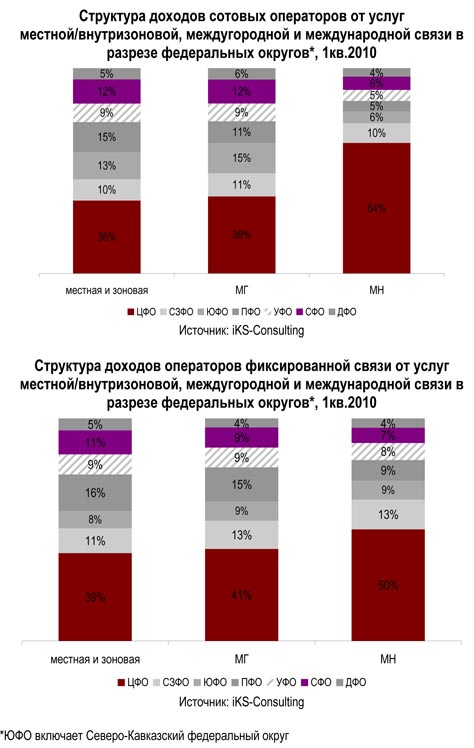 Активный рост трафика и доходов сотовых операторов от услуг международной связи обусловлен увеличением их маркетинговой активности в данном сегменте. Так, в 3 квартале 2009г. оператор Мегафон осуществил ре-запуск тарифа «Теплый прием», ориентированного на активных пользователей дальней связи. В результате прирост объема международного трафика оператора в 4 квартале 2009г. составил 57% по отношению к предыдущему кварталу. Операторы фиксированной дальней связи постепенно теряют свои позиции как в связи с давлением альтернативных решений, предлагаемых сотовыми и IP операторами, так и вследствие ценовой конкуренции между собой, усилившейся в связи с активными действиями Комстара Последствия конкурентной борьбы будут особенно ощутимы по итогам 2010г. Структура рынка дальней связи в разрезе федеральных округов Географическое распределение доходов от услуг голосовой связи в сетях фиксированной и сотовой связи во многом схоже. Однако стоит отметить, что структура доходов от услуг голосовой связи в разрезе федеральных округов разнится в зависимости от направления вызовов. В отличие от доходов местной и внутризоновой связи выручка от услуг междугородной и международной связи более сконцентрирована в ЦФО за счет высокой активности МГ и МН пользователей в столице.