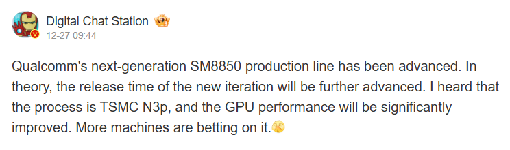 Чипсет наступного покоління Qualcomm, Snapdragon 8 Elite 2, розробляється як наступник Snapdragon 8 Elite. Недавні витоки з Digital Chat Station надають інформацію про очікуваний графік запуску та деталі виробництва.