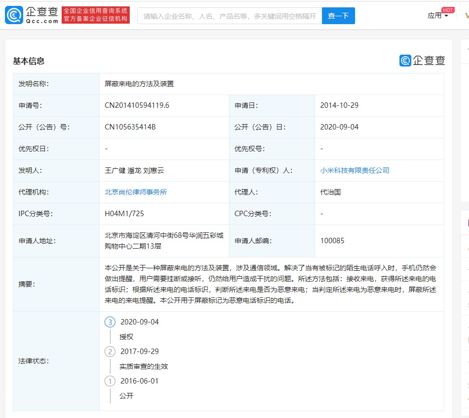 Компания Xiaomi Technology Co., Ltd. опубликовала патент на изобретение под названием «Метод и устройство для блокировки вызовов». Согласно документу, компания фактически подала заявку на этот патент 29 октября 2014 года. Номер приложения – CN201410594119.6, а номер публикации – CN105635414B, что свидетельствует о том, что приложение было авторизовано.