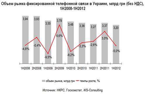 Основной тенденцией на рынке фиксированной телефонной связи Украине в последние годы является снижение как показателей уровня дохода, так и количества пользователей (ОТА, основных телефонных аппаратов). По оценкам iKS-Consulting, объем рынка телефонии в первом полугодии 2012 года составил 3,2 млрд грн., что на 5% ниже показателя за предыдущий отчетный период.