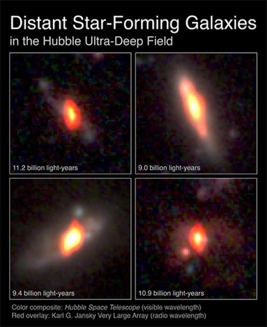 Астрономы впервые наблюдали места формирования звезд в далеких галактиках, находящихся на расстоянии примерно 10 миллиардов световых лет от Земли при помощи радиотелескопов Karl G. Jansky Very Large Array (VLA) и Atacama Large Millimeter/submillimeter Array (ALMA) Национального научного фонда США.