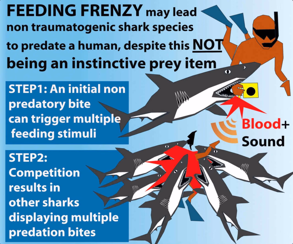 Загиблий плавець був у воді з камерою GoPro, і вчені вважають, що електромагнітні сигнали від неї могли привернути увагу акул, що припливли за частуванням. Одна смілива особина, ймовірно, виявилася найближчою і рефлекторно могла спробувати вкусити камеру, внаслідок чого поранила чоловіка. Кров, що потрапила в море, і звук клацання від зубів у воді спровокували «харчове божевілля» — колективний напад акул, коли ті розривають жертву на частини, конкуруючи один з одним за видобуток.