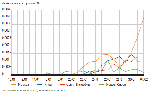 Чем холоднее становилось этой зимой жителям того или иного города, тем чаще они спрашивали про погоду. Такую интересную закономерность обнаружили специалисты Яндекса. Проанализировав поисковые запросы москвичей, петербуржцев и киевлянам и жителей Новосибирска в холода, они также отметили, что явно зависит от температуры и интерес к обогревателям — чем холоднее на улице, тем больше они нужны. Люди начинают не только больше спрашивать о них в поиске, но и чаще просматривать разделы «Обогреватели», «Радиаторы» и «Отопительные системы» на Яндекс.Маркете. Кстати, в отличие от стоимости вентиляторов и кондиционеров, которая, бывает, увеличивается с каждым градусом жары, цена на обогреватели в течение зимы 2012 была стабильна.