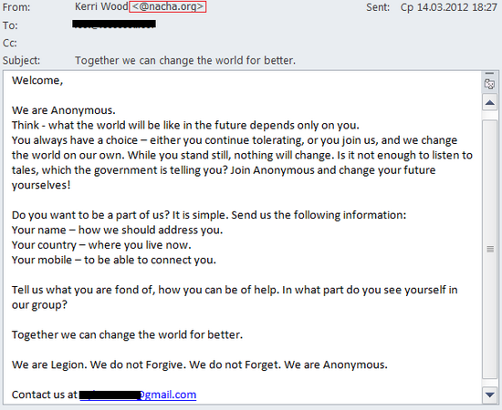 Не остались в долгу и мошенники, которые также проявили чудеса изобретательности. Особого внимания заслуживает рассылка якобы от имени хакерской группировки Anonymous. В письме, составленном в характерной манере, лже-анонимусы предлагали получателю письма поддержать их протест против действий правительств разных стран. Для этого пользователю надо было всего лишь прислать на указанный в письме адрес свое имя, название страны проживания и мобильный телефон. Подобные действия могут показаться вполне безобидными, однако не стоит забывать, что злоумышленники могут распорядиться полученными данными по своему разумению весьма неприятным образом. Например, подписать владельца телефона на платную услугу.